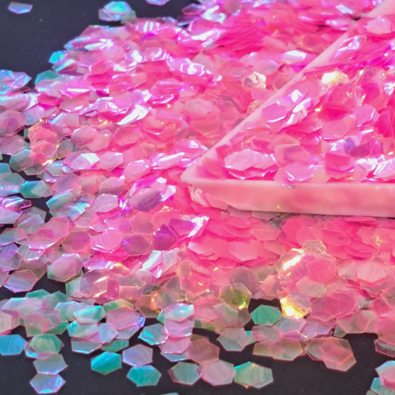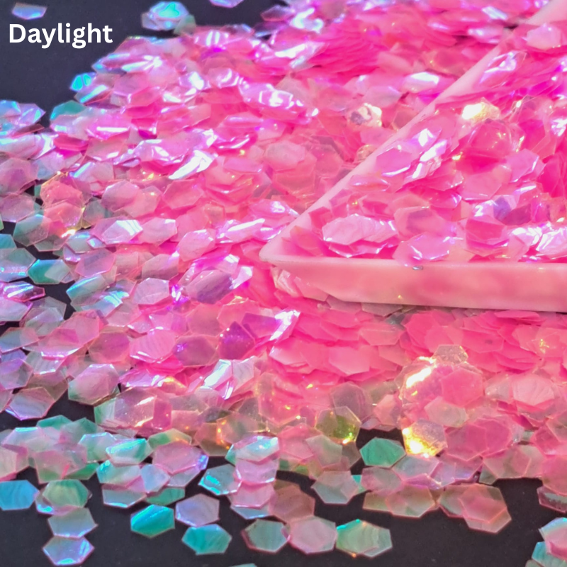 Our UV Reactive Popping Pink 5mm hex size glitter is suitable for nail art, face, hair, body and craft decoration and is supplied in a 10ml pack size