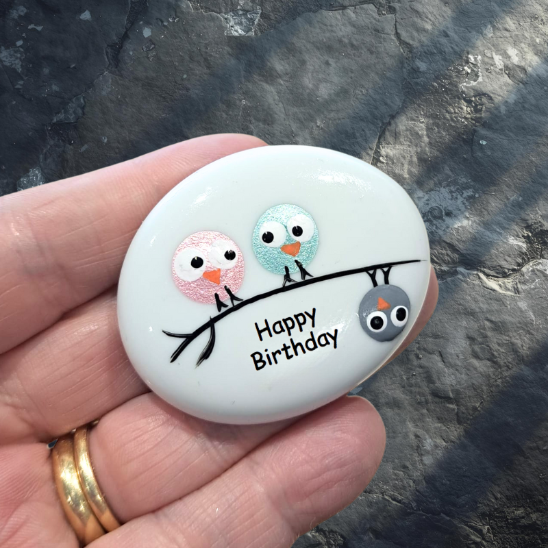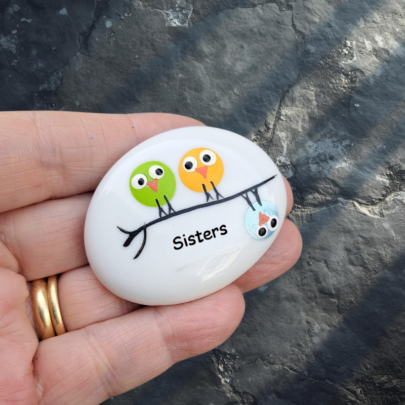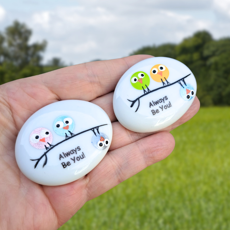 We hand paint the design onto the glass pebble and gloss varnished to seal and protect.
