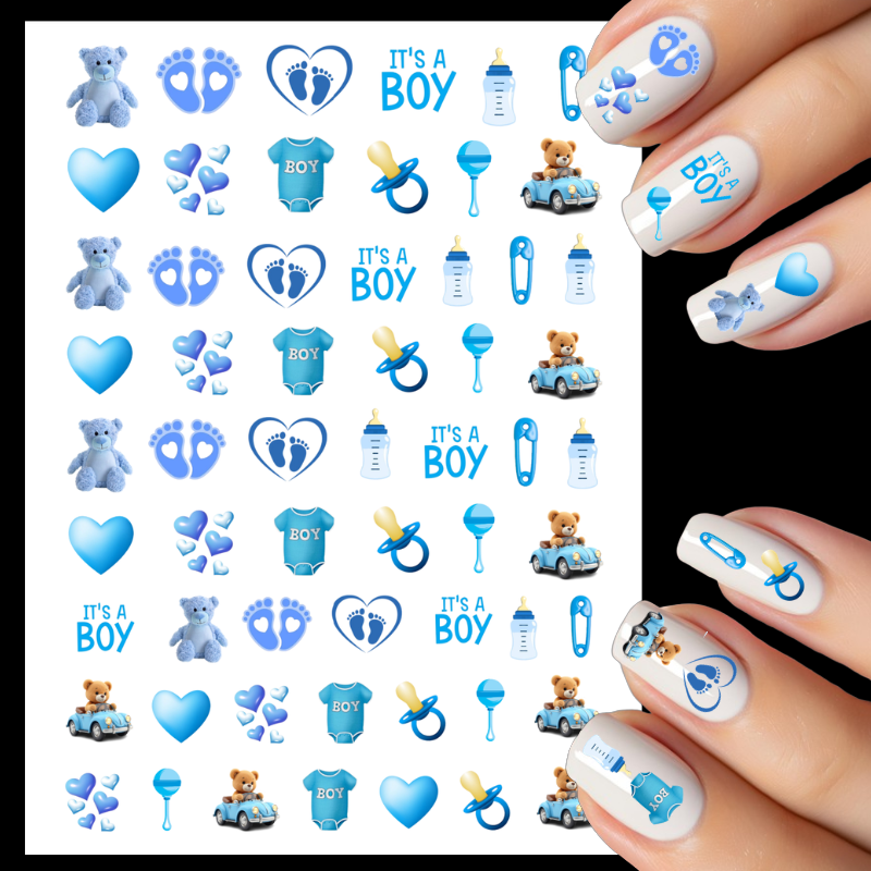 Our Its a boy baby reveal slide Decals contains 59 decals in 3 different sizes to fit all nail sizes and are created on a transparent background.