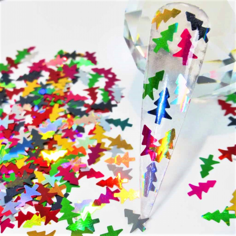 The trees are 8mm tall and the colours are all in holographic red, silver, green, gold and black.