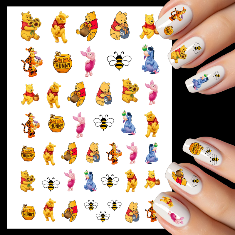 Our Winnie The Pooh water decals are a lovely way to decorate your nails and crafts and contain 44 images per sheet in 3 sizes to fit all nails and are created on a transparent background,