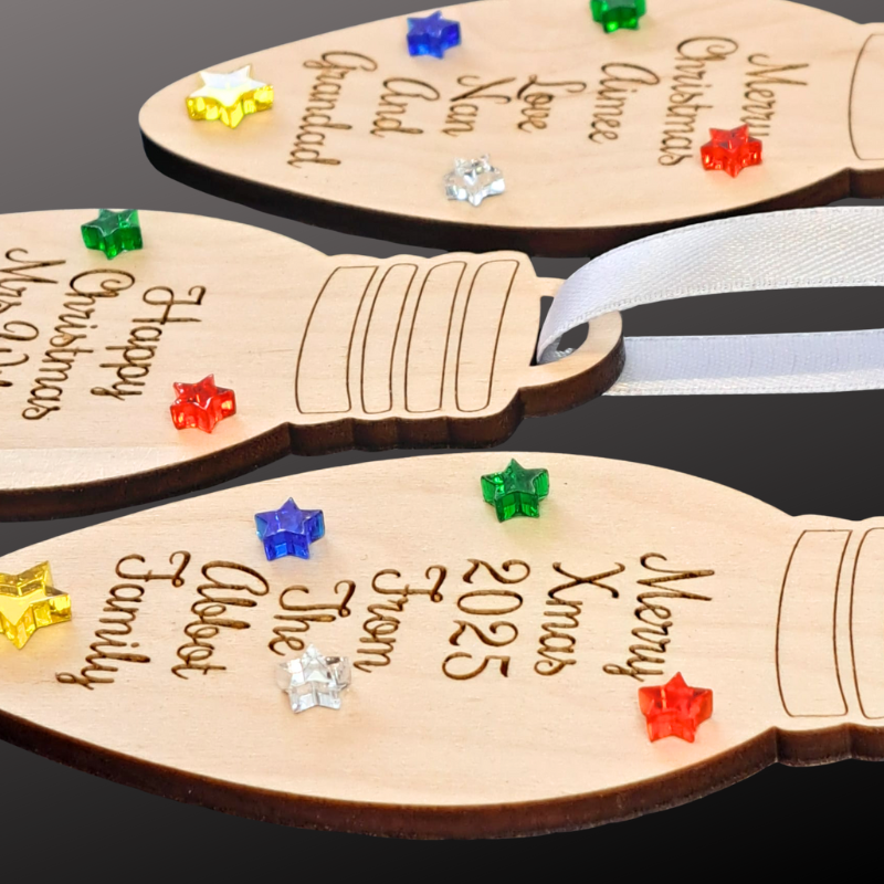 The baubles are laser cut and engraved with mirror acrylic stars to give that extra special touch to the design.