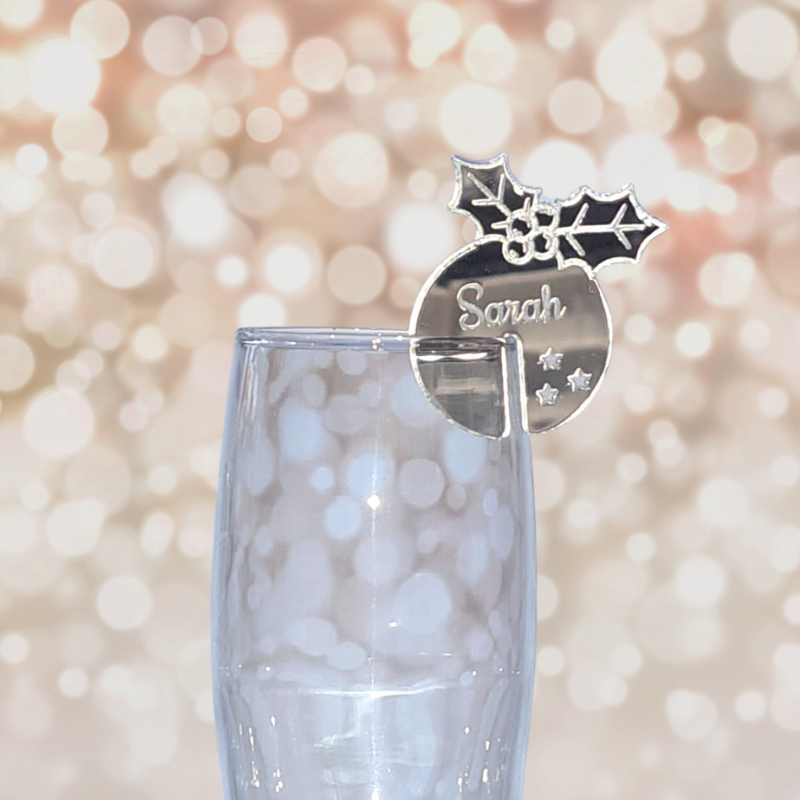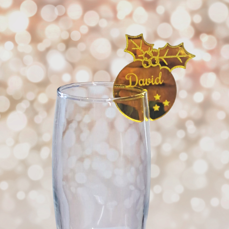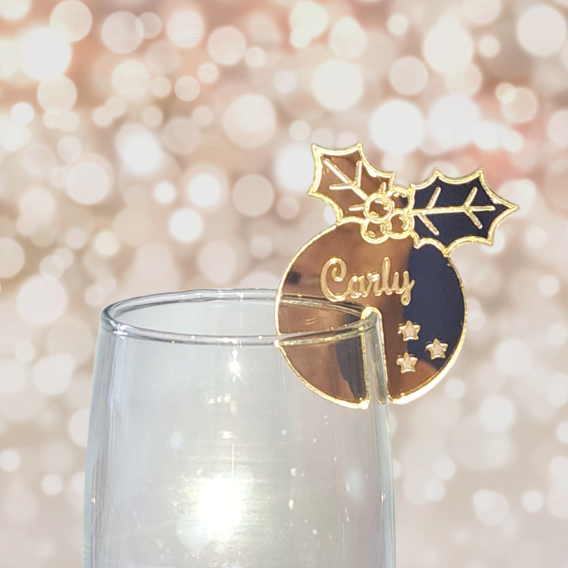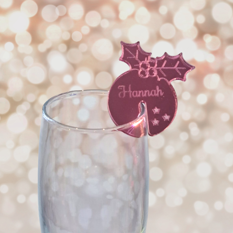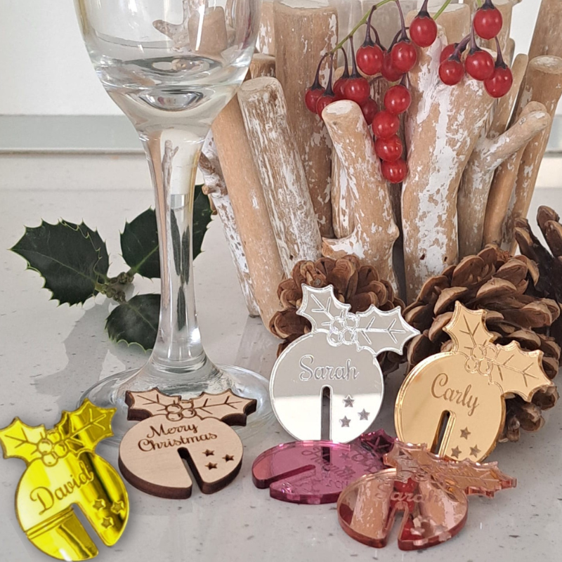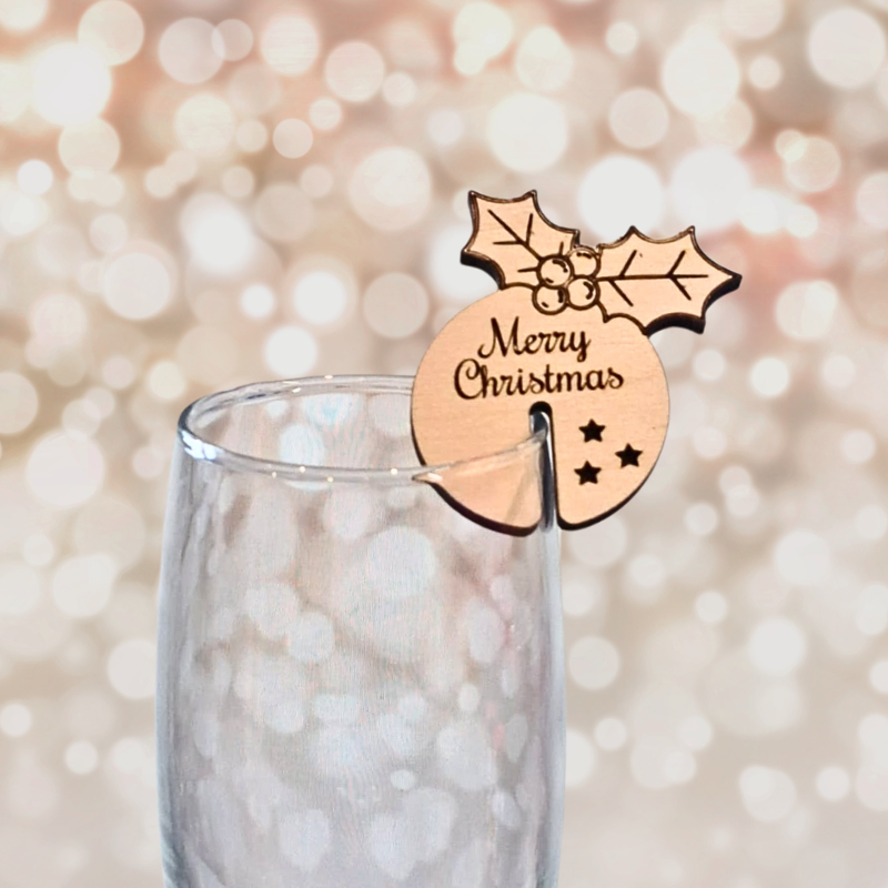 These drinks marker charms have a holly and berries design and are created with maple wood and mirror acrylic materials and are 4.8cms in height and 4.59cms in width.