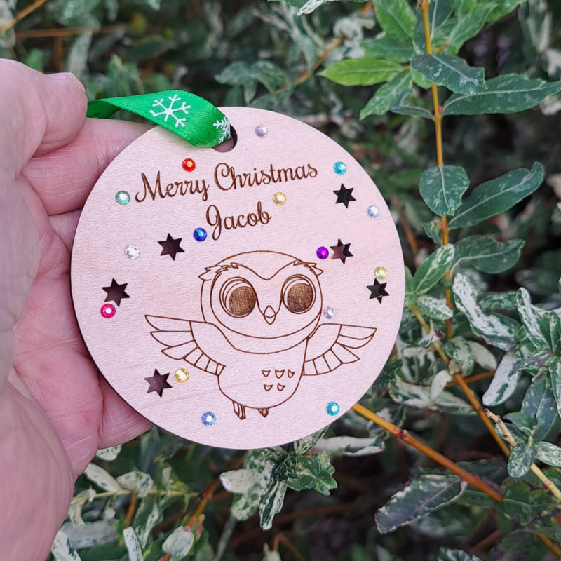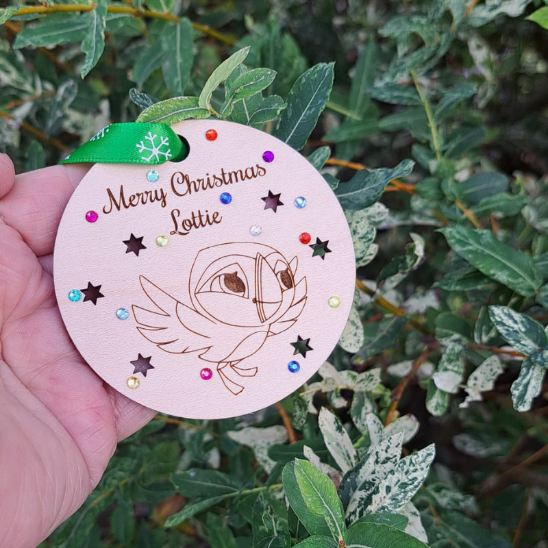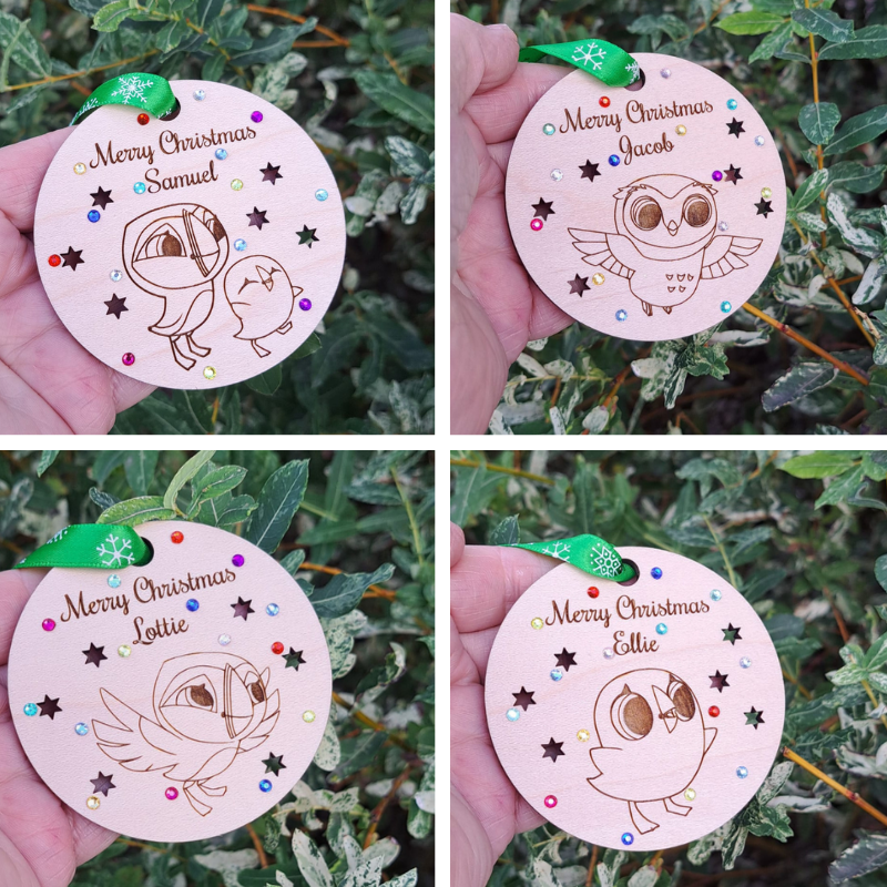 The baubles are approx 7.5 cms (3 inches) in size and made from maple wood and are engraved with a choice of Puffin Rock character images of your choice and Merry Christmas text with cut out star shapes and crystals which also includes a ribbon for hanging.