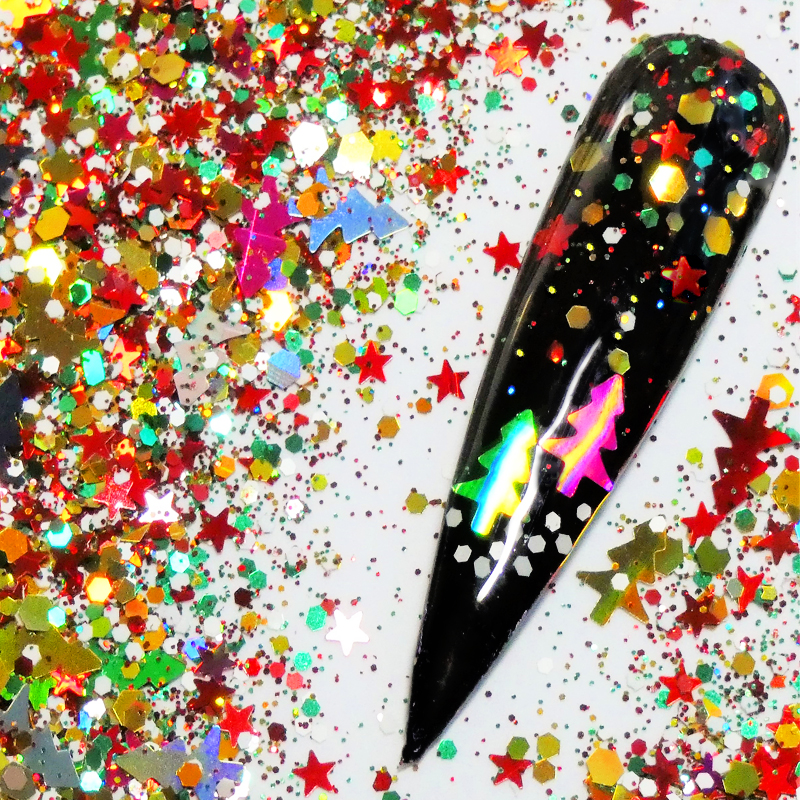Our Sant Claus Is Coming To Town is a holographic glitter contains fine .008 glitter with hex shapes, Christmas Trees, and star shapes and can also be used with resin and craft decoration and supplied in a 5g pack size.