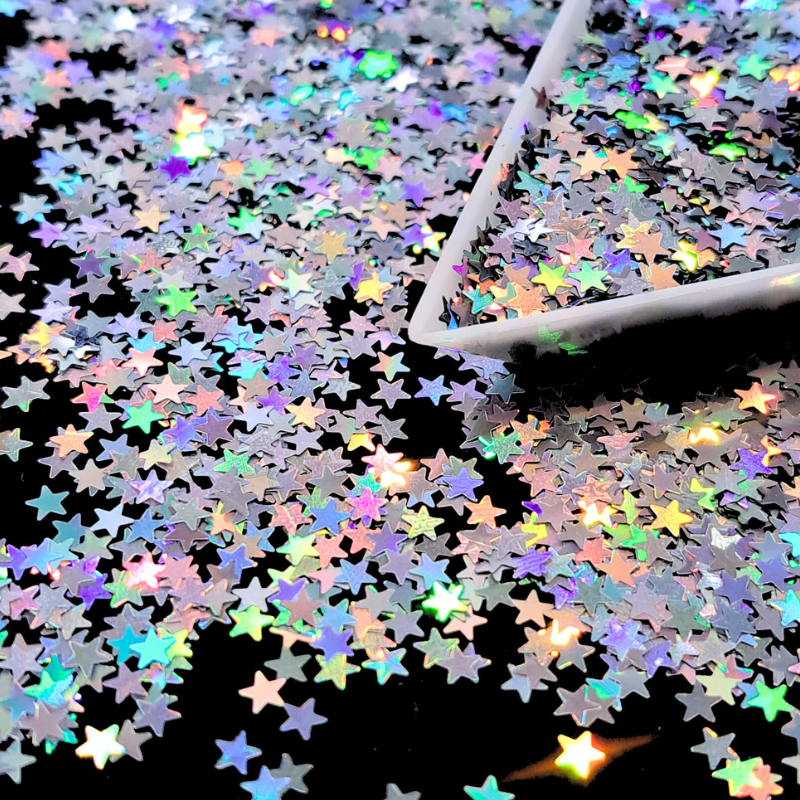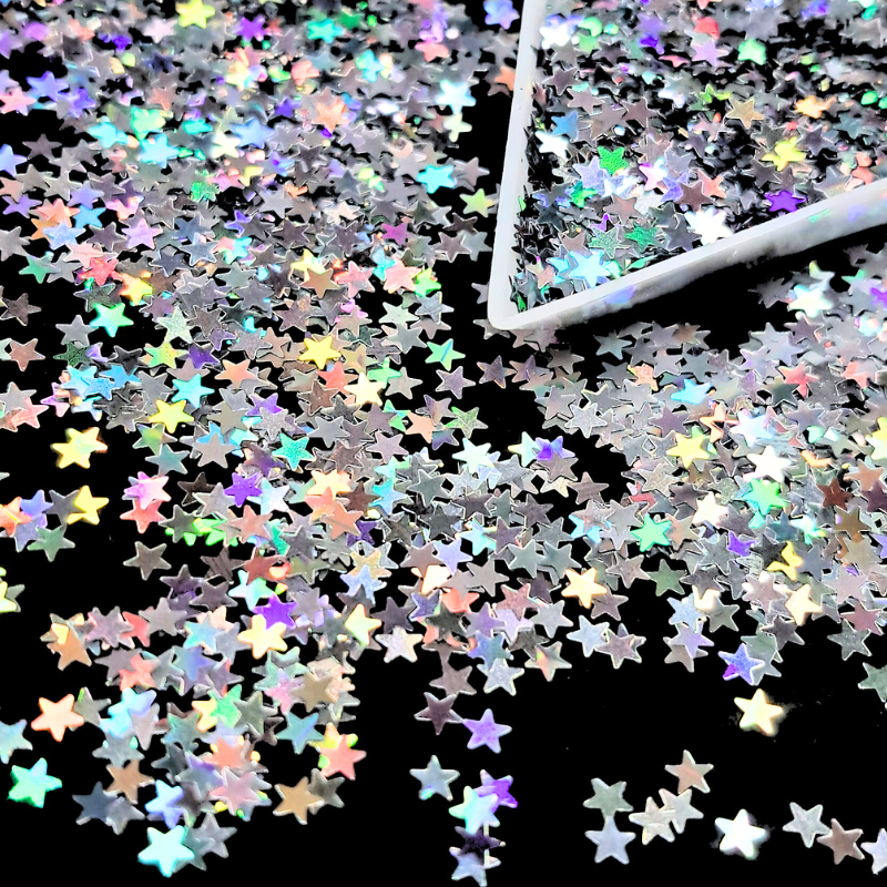 Our 3mm Silver Holographic Stars are supplied in a 5g pack size.