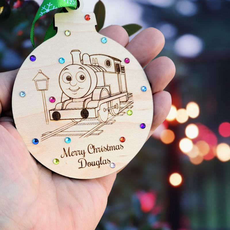 The baubles are approx 9.58cms in height and 7.62cms in width and made from maple wood with rhinestone crystals for that added effect and are engraved with the Thomas The Tank Engine image and Merry Christmas text and include a ribbon for hanging.