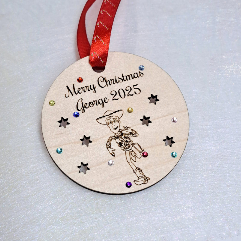 The baubles are approx 7.5 cms (3 inches) in size and made from plywood and are engraved with the Toy Story images and Merry Christmas text with cut out star shapes and crystals which also includes a ribbon for hanging.