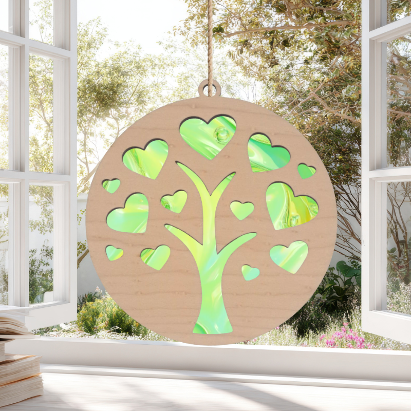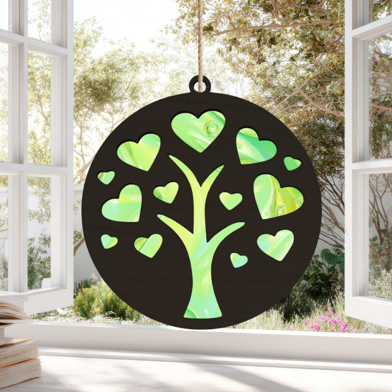 The round tree with hearts resin art suncatcher cut outs can be ordered in either 4mm maple wood or 3mm black acrylic.