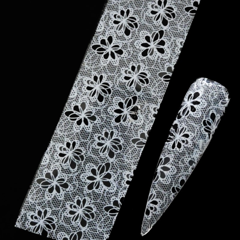 Our white lace nail art transfer foil is 1 metre in length by approximately 2.5cm wide.